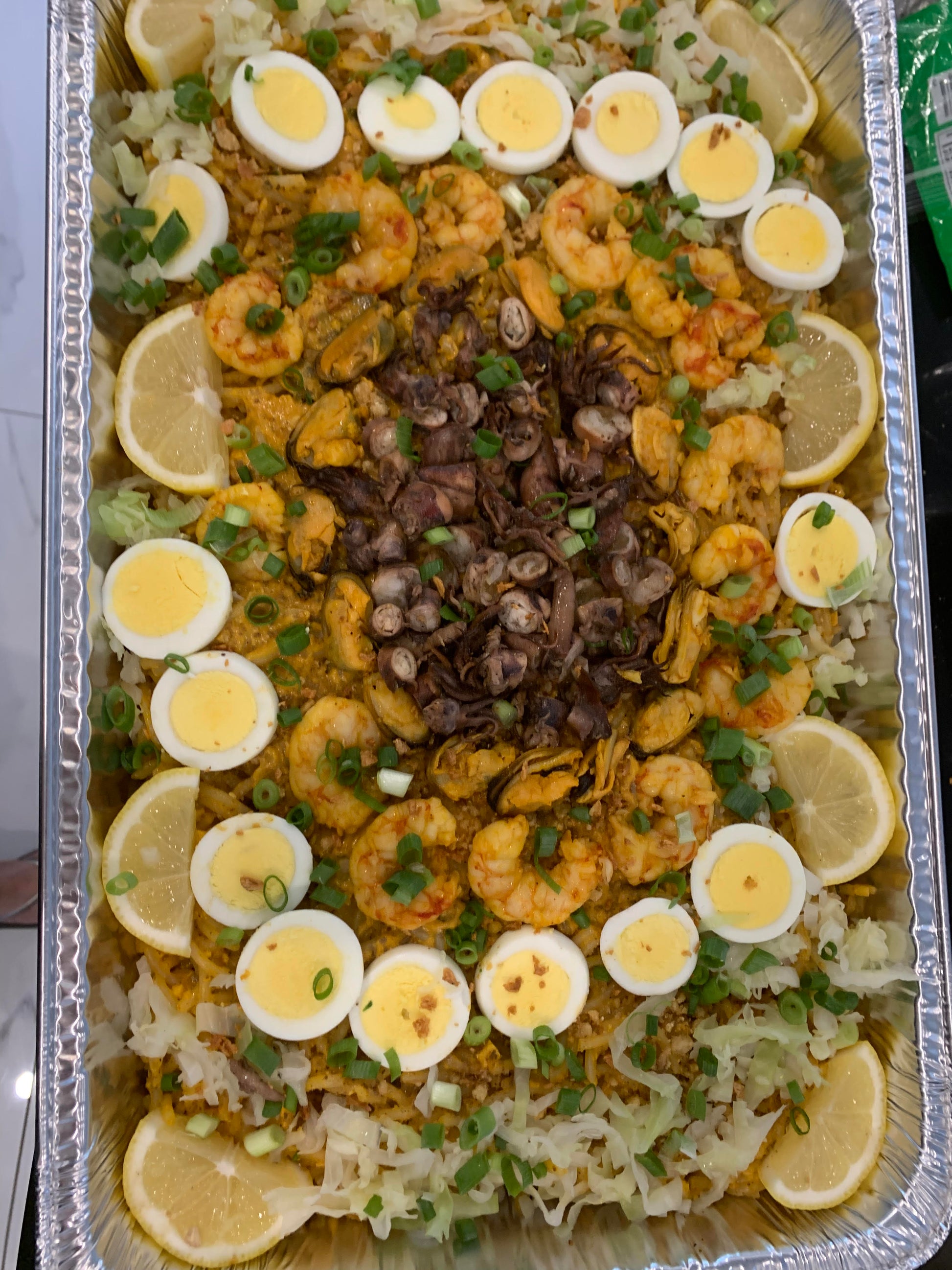 A Filipino party favorite known for its thick rice noodles coated in a rich, savory seafood sauce. Topped with fresh shrimp, squid, smoked fish flakes, boiled eggs, and crisp vegetables, this dish is a feast of bold flavors and vibrant colors — perfect for any celebration.